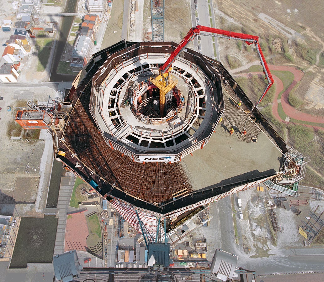 Vridning av byggnadens planlösning med 90° över totalt nio enheter, avsmalning av väggtjockleken i byggnadens runda kärna från 2 m till 40 cm, produktion av plattor och väggar i en arbetscykel